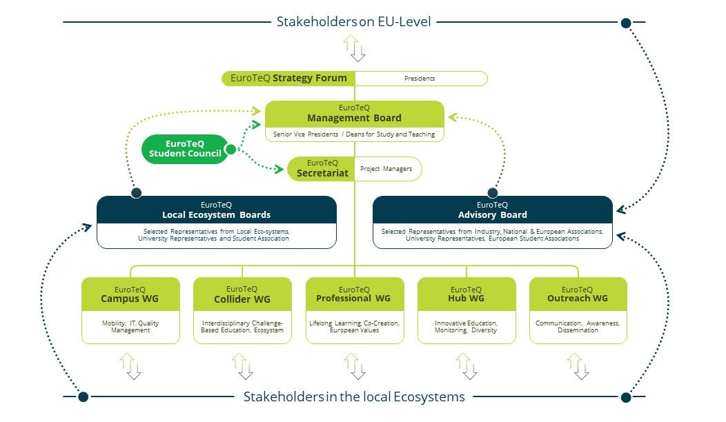 The EuroTeQ management is agile and lean. Its structure is based on equal rights and shared responsibilities. It engages presidents and students, stakeholders in the local eco-systems and from the European level. The governance structure includes the EuroTeQ Presidential Strategy Forum, ensuring long-term strategic alignment and development. The EuroTeQ Management Board is the core body and steers as well as implements the project, supported by the EuroTeQ Secretariat. The EuroTeQ Engineering University Advisory Board engages representatives from European and other transnational organizations. The EuroTeQ Engineering University Local Advisory Boards engage representatives of the local eco-systems. The EuroTeQ Student Council brings together the student representations at each university, they advise the Management Board. For each of the six Work Packages, Working Groups (WGs) are established with strong WP leads and representatives from all Partner Universities.