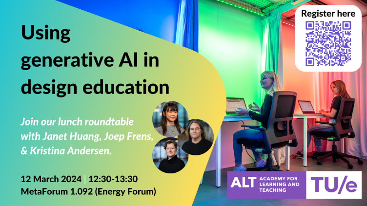 Using generative AI in design education will take place on 12 March 2024, from 12:30 to 13:30, at MetaForum 1.092 (Energy Forum). The event is open to both teachers and support staff. Registration is free, and can be done here. Complimentary food and beverages catering to different dietary options are available to those attending in person.