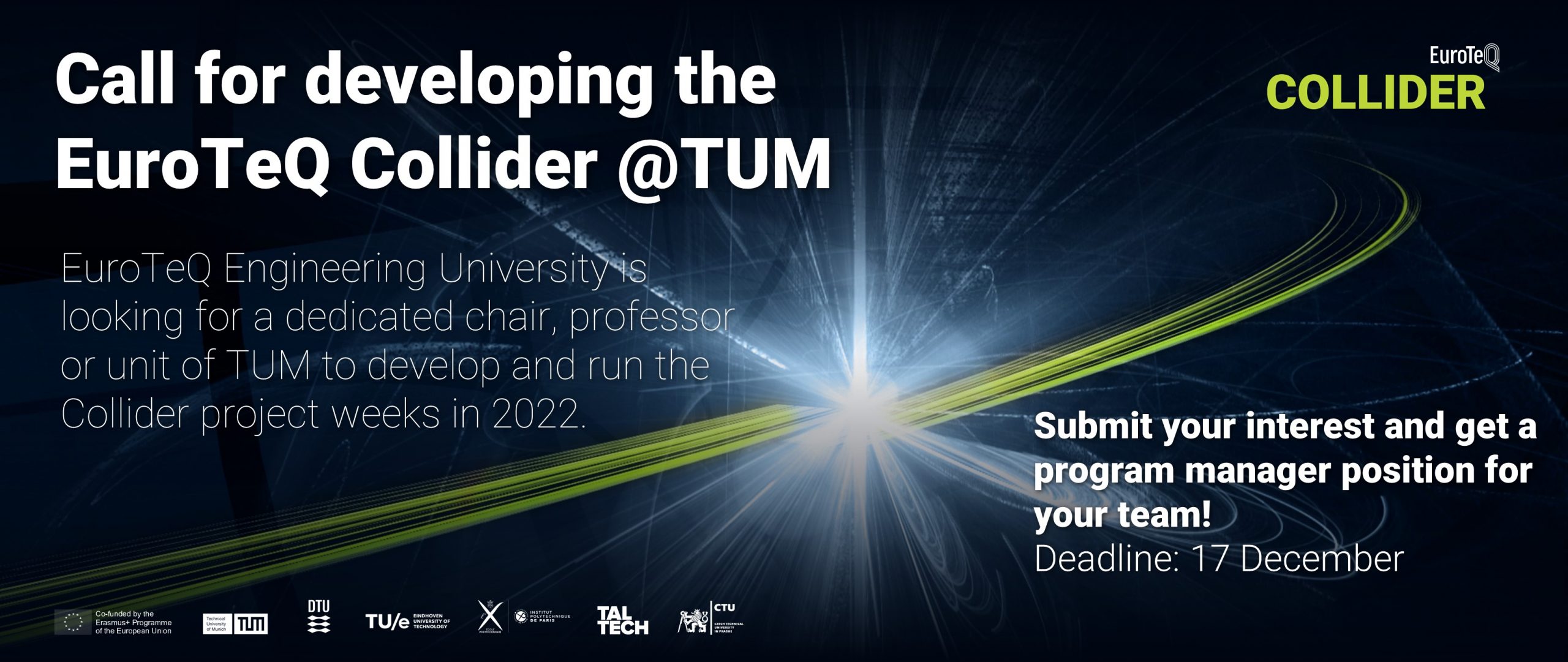 Call for developing the EuroTeQ Collider project weeks at Technical University of Munich The EuroTeQ Engineering University is looking for a dedicated chair, professor or